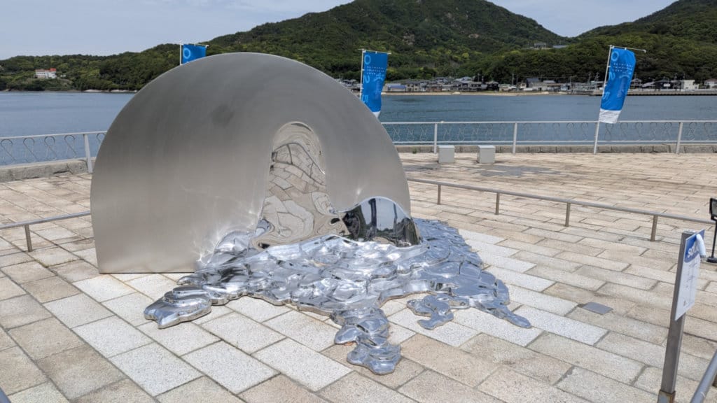 "Again..." (2019) by Kim Kyoung-Min appears to be just a semi-circle of partially melted metal. However, it contains an "easter egg." If you look closely at the "melted" part, you will see that it is actually a map of Shodoshima.