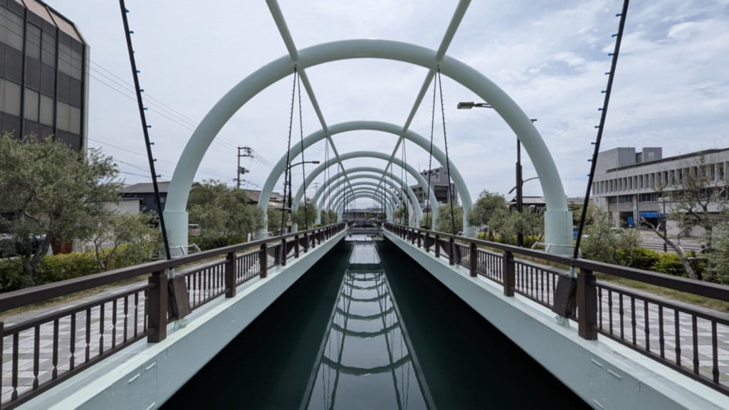 This canal crossing Tonosho is not actually a canal. It's a strait. Tonosho Port, downtown Tonosho, and the famous Angel Road are not technically on the island of Shodoshima. They're on an island that's separated from Shodoshima by a narrow strait called the Dofuchi Strait. In fact, it's so narrow that it's listed in the Guinness World Records as the narrowest strait in the world. At its narrowest point, it's only 9.93 meters wide (more or less where I'm standing taking this picture).